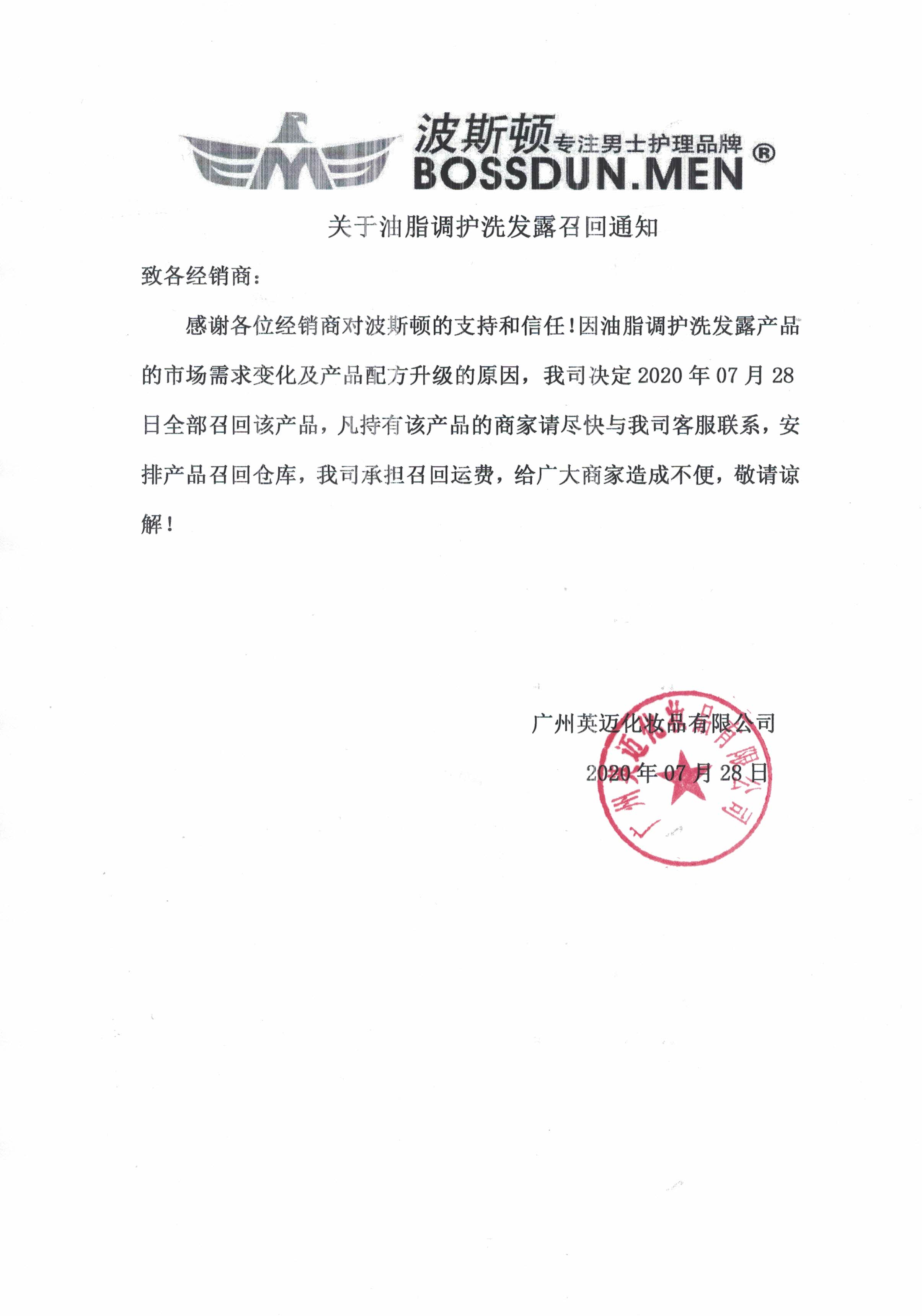感謝各位經銷商對波斯頓的支持和信任!因油脂調護洗發(fā)露產品的市場需求變化及產品配方升級的原因,我司決定2020年07月28日全部召回該產品,凡持有該產品的商家請盡快與我司客服聯(lián)系,安排產品召回倉庫,我司承擔召回運費,給廣大商家造成不便,敬請諒解!